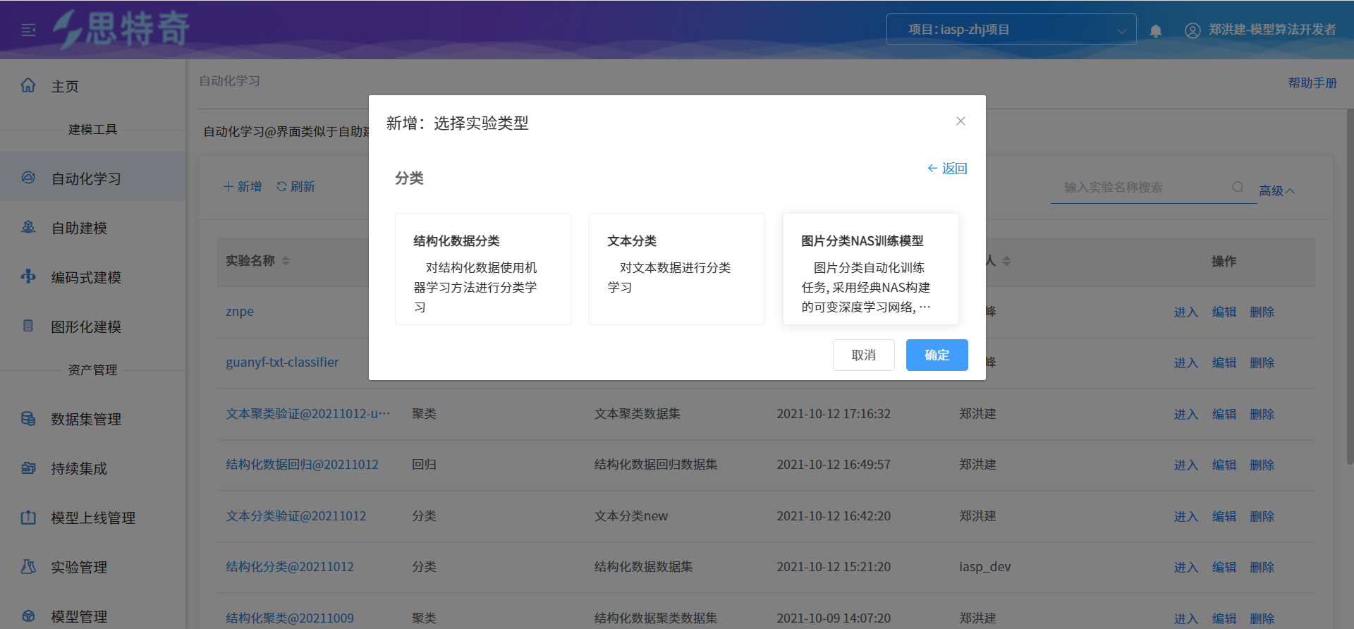 创建自动化学习,在数据集管理功能创建自动化学习的训练数据,根据实验类型、数据集、不同实验类型对应的配置参数创建自动化学习流程。