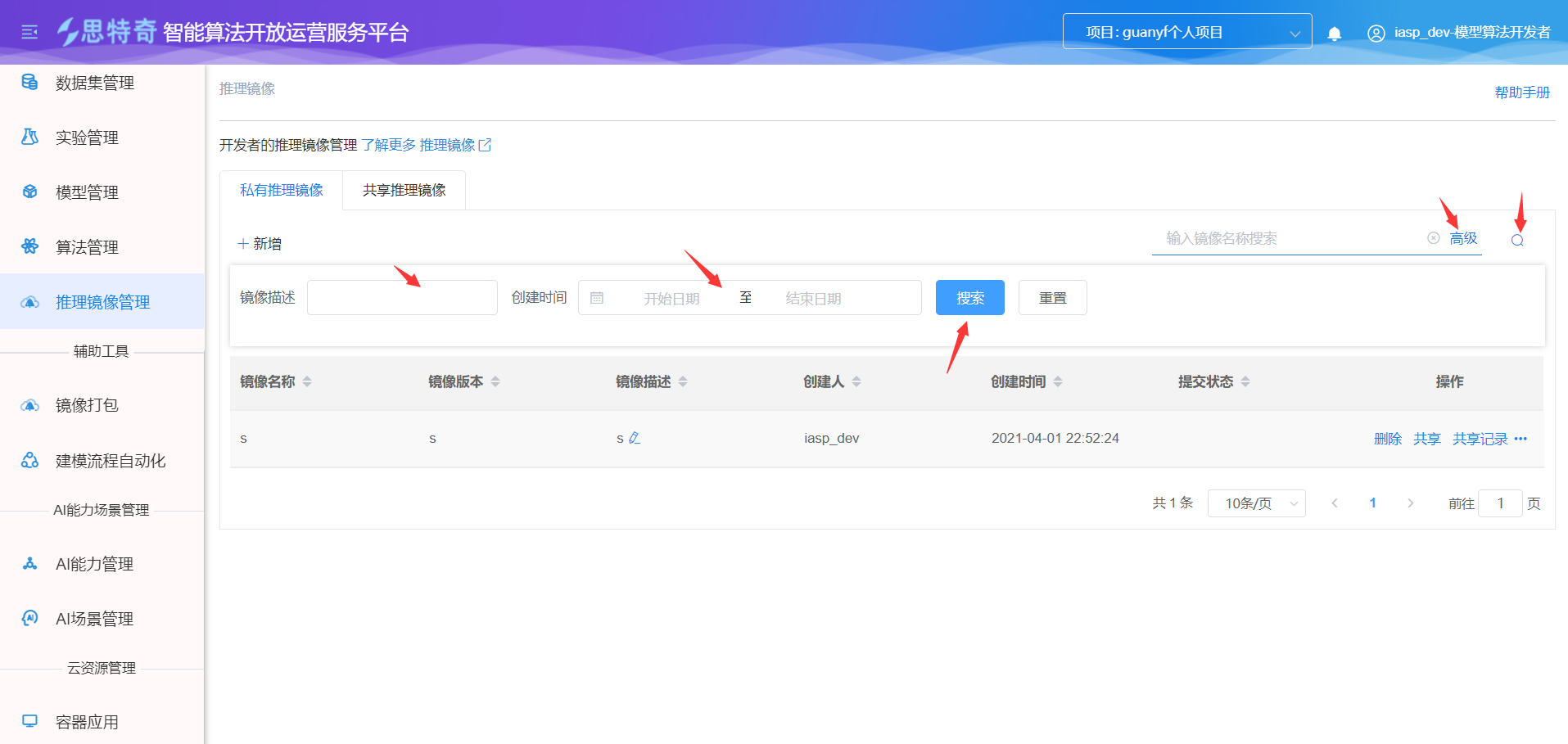 - 进入页面点击共享共享推理镜像 tab 标签,查询对应数据