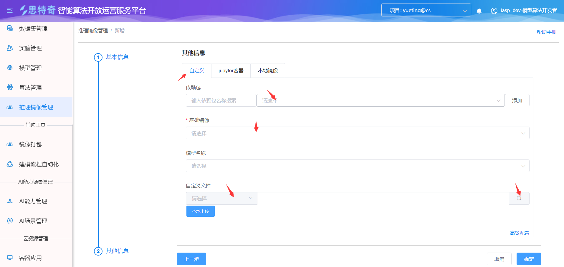 选择自定义,填写依赖包、基础镜像、模型名称、自定义文件信息,点击确定即可